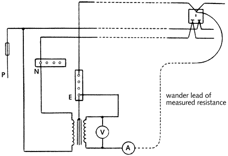 3 - If it is still felt that the protective conductor resistance is suspect, the high current test using 1.5 times the circuit design current (with a maximum of 25 A) may be used (see {Fig 8.3}. The protective circuit resistance together with that of the wander lead can be calculated from: